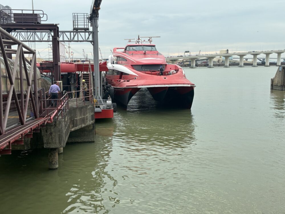 乗船場には、赤い船体のターボジェットと青い船体のコタイウォータージェットがあり、それぞれマカオ外港とマカオタイパへ向かうのですが、最初にマカオの世界遺産を見たかったので、世界遺産の近くまで行くターボジェットで移動しました。