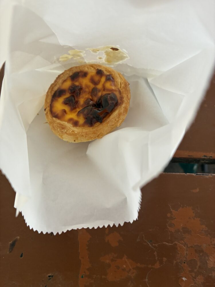 近くにあるエッグタルトが有名な「瑪嘉烈蛋撻店(マーガレット カフェ イ ナタ)」で購入して、お店の前に置いてあるイスに座って食べました。上にあるクリームが濃厚で、下にあるパイ生地もサクサクしてとても美味しかったです。