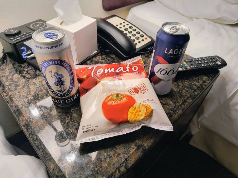 食後はセブンイレブンでビールと香港限定のカルビーポテトチップストマト味を買い、明日に備えてゆっくりしました。