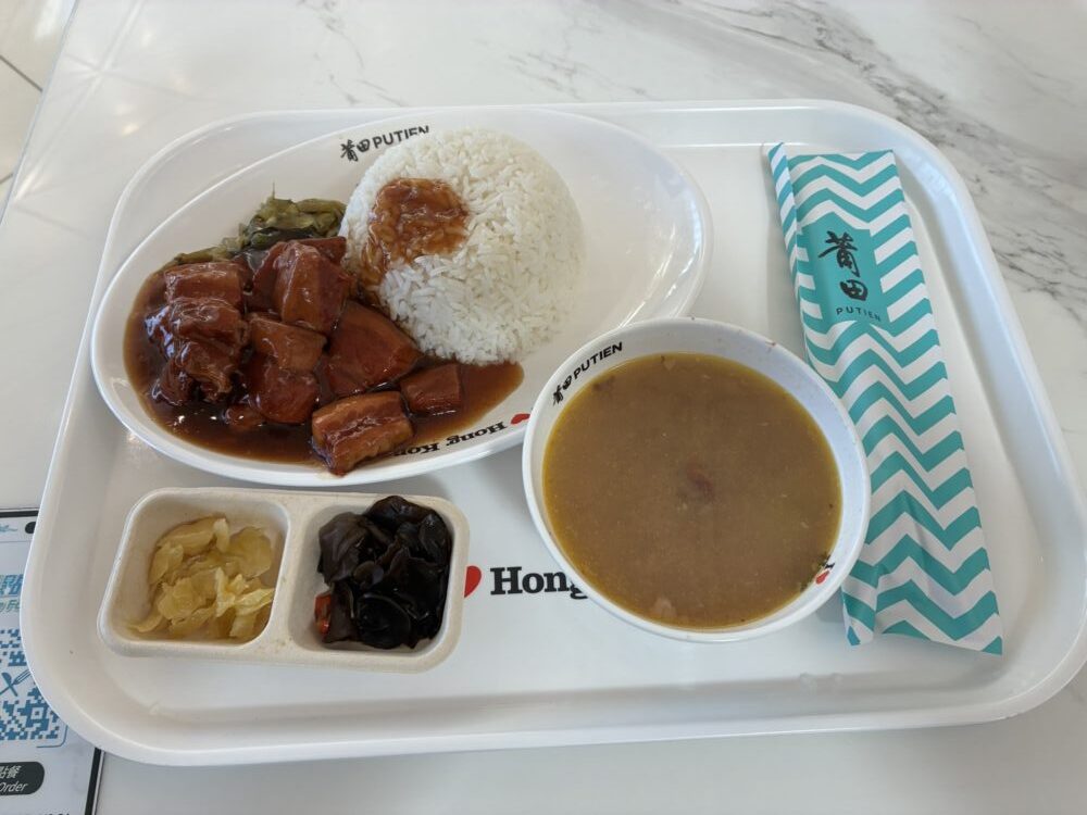 お昼になったので、フードコートで豚バラ肉の煮込み定食を食べ、時間をつぶしているうちに、搭乗時間になり、香港雑貨はあきらめ、搭乗口近くにあったスターバックスで香港限定のマグカップを購入(150HK$=3000円)。