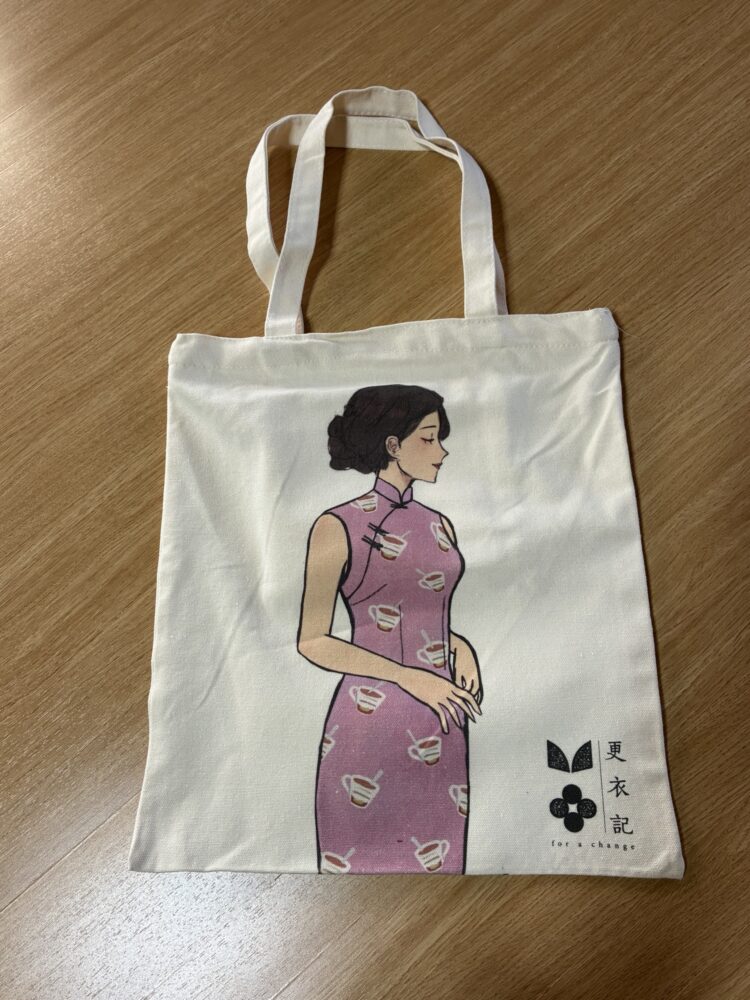 PMQで見つけた雑貨屋さんでチャイナ服にミルクティーの柄が入ったトートバッグ(150HK$=3000円)を購入。